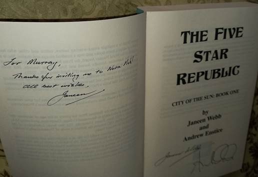You might recall the offer from our June guest Janeen Webb for book sales. I purchased Five Star Republic, it’s 500 pages, and it came with a thank-you which I believe is to the entire Mob.